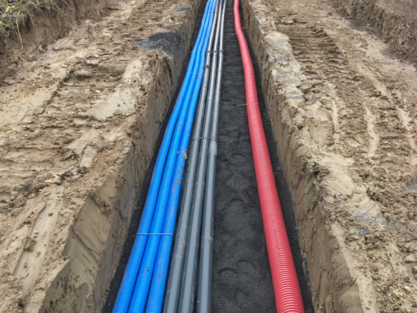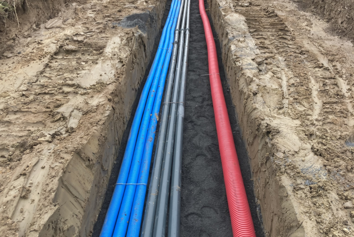 Le terrain est raccordé ( eau, compteur EDF, Tél, assainissement TAL avec pompe de relevage fournie) et prévoir un puits perdu pour la rétention des eaux pluviales.