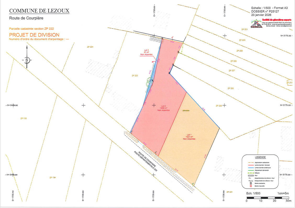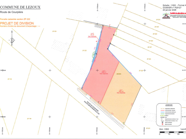 Lezoux, en direction de Courpière, beau terrain plat (Lot 1) non viabilisé de 1.521 m2 en bordure de route .